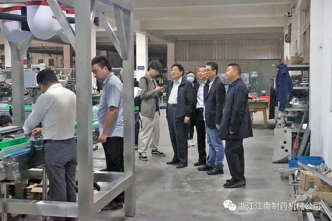 杨松董事长接待陈秘书长等一行,陪同来访领导走进公司铝塑泡罩包装机车间、高效智能包衣机车间、药品包装自动生产线车间以及成品展示车间。